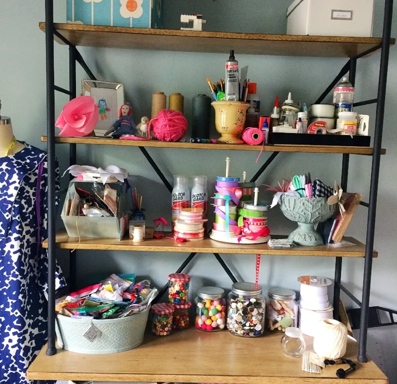 In the sewing room, I keep my supplies, notions, machines, books, patterns and trims. Just outside the room is a larger area that has my cutting table, fabric storage, and ironing board. It's nice to be able to spread out and not have to worry about little hands getting in the way.